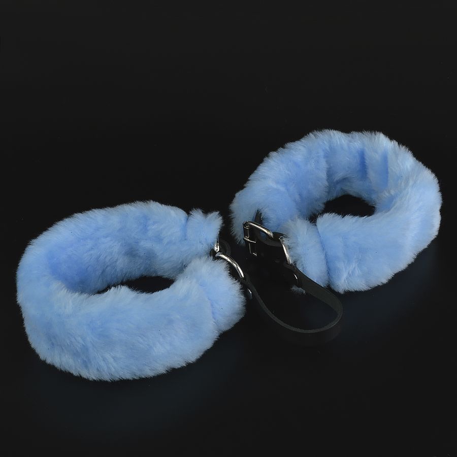 Купить Черные кожаные оковы со съемной голубой опушкой Sitabella по лучшей цене с доставкой - секс-шоп Ynunu.ru