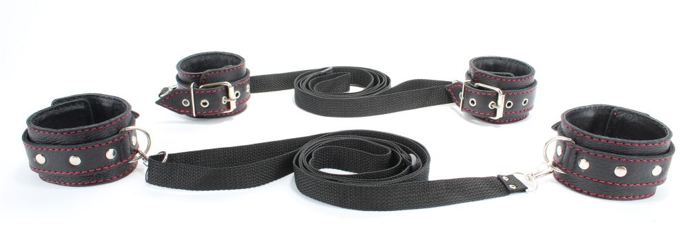 Набор для связывания состоит из наручников и оков, выполненных из натуральной черной кожи с контрастной красной строчкой, декорированных холнитенами, и двух бондажных ремней с карабинами. Длина ремней регулируется от 110 до 220 см. Аксессуары фиксируются на теле при помощи ремней и металлических пряжек. Наручники подойдут на обхват руки от 15 до 25 см, оковы подойдут на обхват от 16 до 27 см. Не ограничивай себя во власти или получай удовольствие от сладких ограничений! Ширина ремней - 2 см.