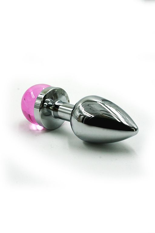 Анальная пробка из алюминия размер S. Изделие дополнено выпуклым украшением из стекла сферической формы розового цвета. Упакована в вельветовый мешочек для хранения. Вес - 85 гр.