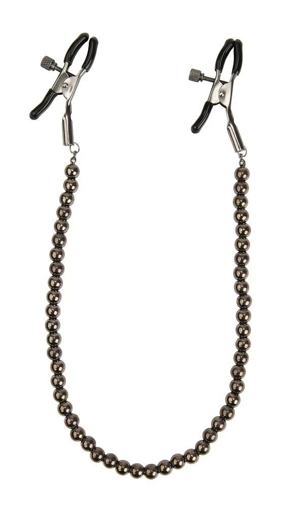 Зажимы на соски с цепочкой из бусин служат дополнительным стимулятором одной из самых чувствительных зон. Включают в себя 2 полностью регулируемых многофункциональных зажима. Имеют мягкие наконечники, между собой зажимы соединены цепью из бусин, которая одновременно служит своеобразным утяжелителем для дополнительных ощущений. Размеры зажима - 6,25х1,25 см.