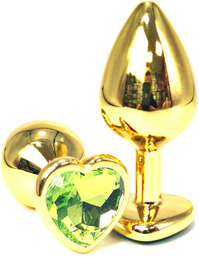 Купить Золотистая анальная пробка с салатовым кристаллом-сердцем - 7 см. Vandersex по лучшей цене с доставкой - секс-шоп Ynunu.ru