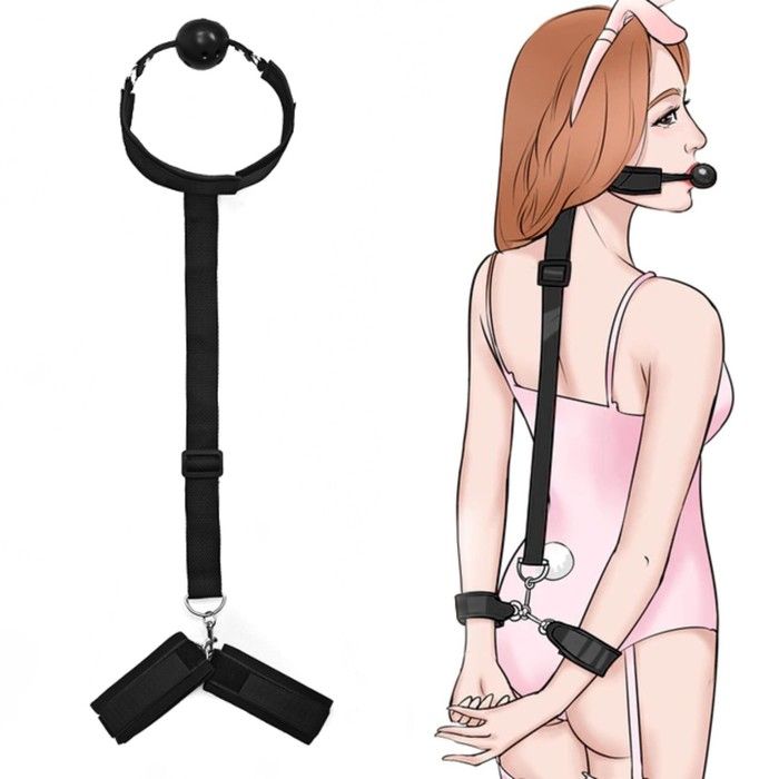 Черный кляп-шар с фиксацией рук за спиной.