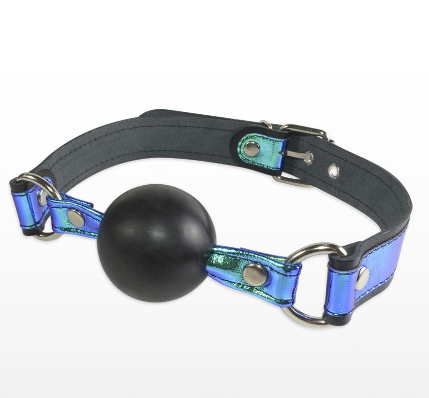 Эффектный девайс в виде сферического кляпа с яркими ремешками из натуральной высококачественной кожи чёрного цвета, сделает ролевые игры особенно страстными и запоминающимися. Ремешки кляпа декорированы голографическими вставками синего цвета, который отливает изумрудным, салатным и бирюзовыми оттенками. Кляп-шар не способен повредить зубы и прост в гигиеническом уходе, достаточно промыть теплой водой с мыльным раствором. Легко зафиксировать девайс на шее и отрегулировать размер можно при помощи пряжки. Вся используемая фурнитура имеет хромированное покрытие. Ширина ремешков - 2,5 см.