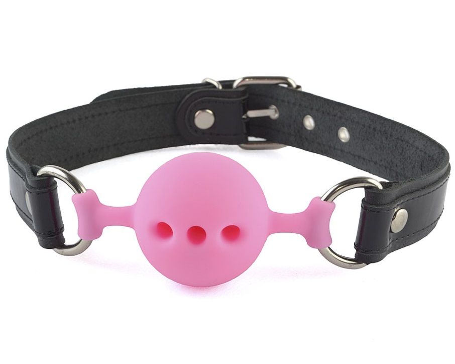 Кляп с оригинальным кожаным ремешком и лаковыми вставками черного цвета. Сам кляп-шар изготовлен из силикона в розовом исполнении, приятного на ощупь, со специальными отверстиями, пропускающими воздух.