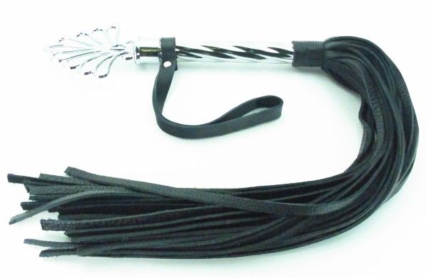 Плеть выполнена из натуральной кожи черного цвета. Витая рукоятка сделана из металла цвета блестящего хрома, сверху декор в виде короны. Количество хвостов - 40 штук. Для удобства на рукоятке расположена петелька. Стильный аксессуар поможет воплотить эротические фантазии в реальность. Длина рукоятки без декора - 16 см.