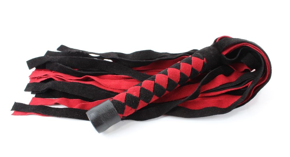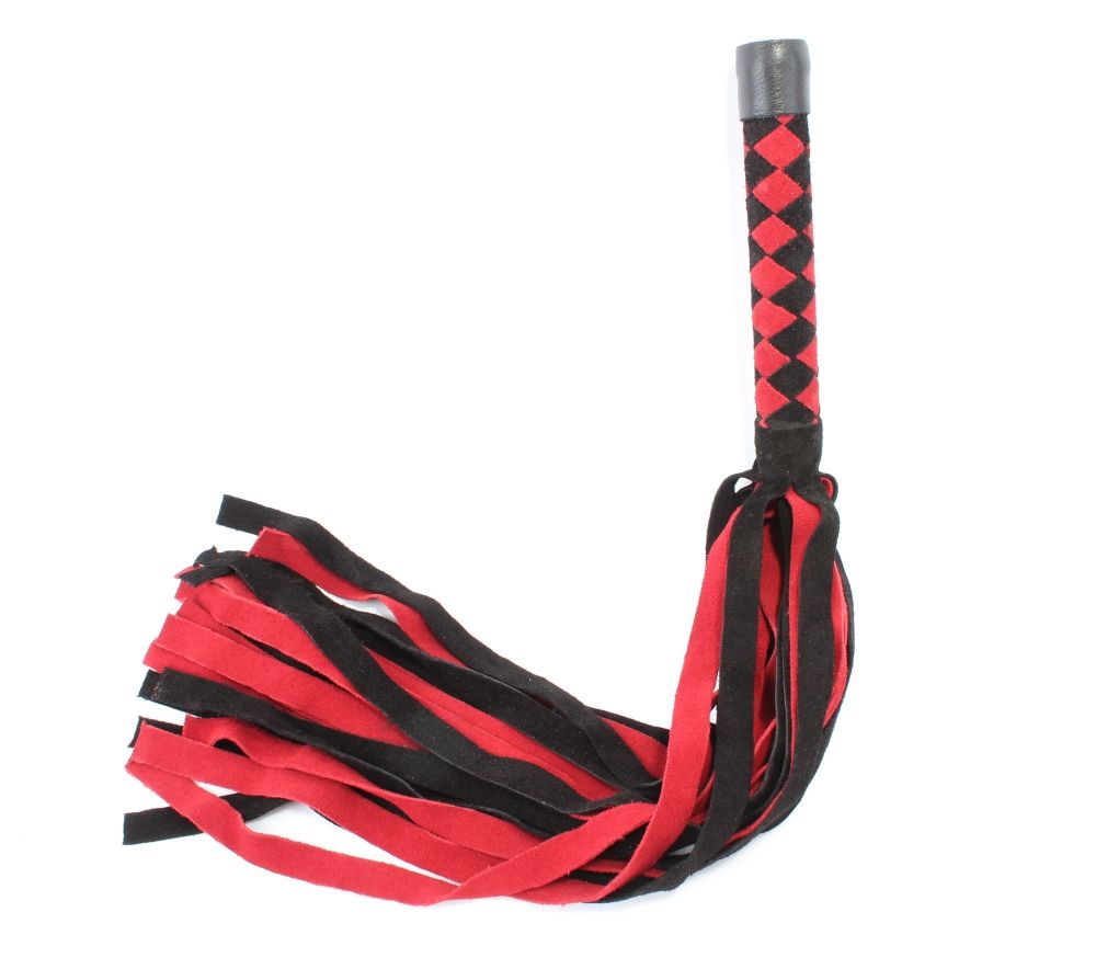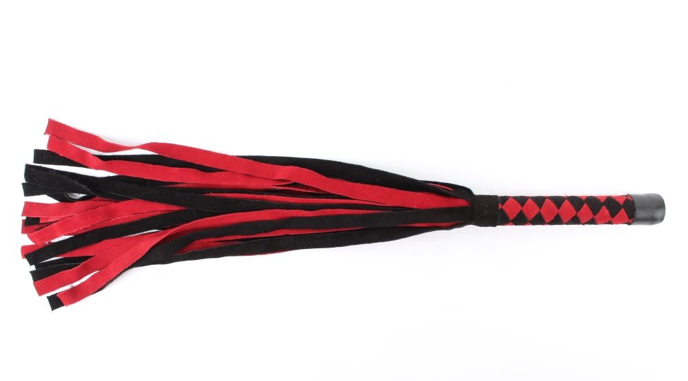 Плеть выполнена из натуральной замши черного и красного цветов. Рукоятка украшена шахматным плетением. Длинные широкие хвосты делают аксессуар эффектным. Количество хвостов - 24 штуки. Возбуждающая воображение плеть поможет воплотить задуманное в реальность. Длина хвостов - 40 см.