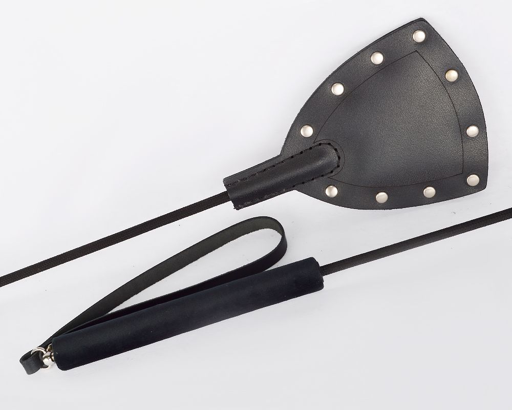 Стек состоит из жесткой рукояти, гибкого полимерного хлыста и хлопушки из натуральной кожи.
