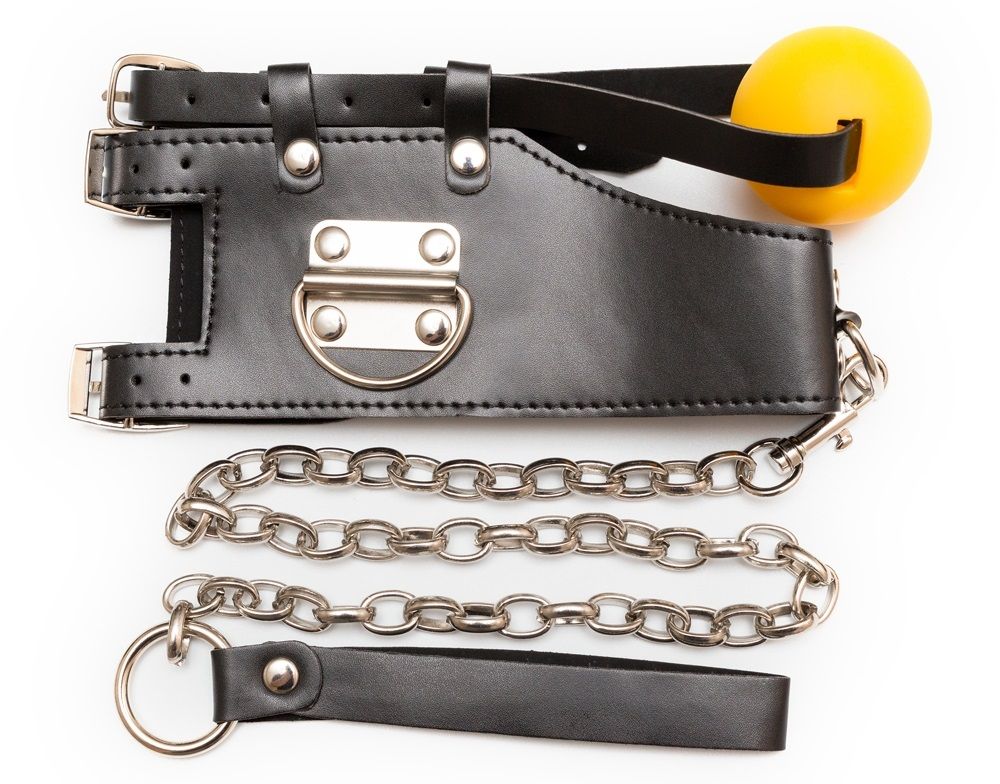 Кляп-шарик, соединенный с широким брутальным ошейником и пристегивающимся на карабин поводком. Качественное исполнение, материал - эко-кожа и безопасный пластик, декор из белого металла, удобная ручка поводка. Размер регулируется при помощи металлических пряжек.