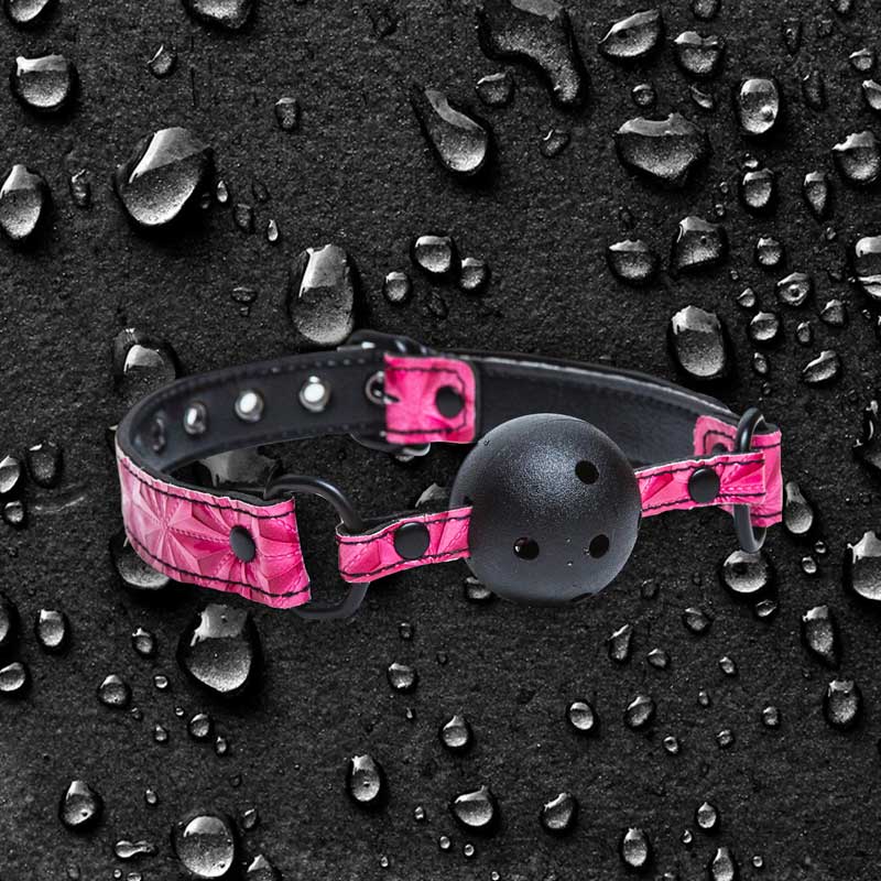 Дышащий пластиковый кляп с регулируемым ремнем крепления из розового винила с формовым рисунком. Шарик имеет отверстия для облегченного дыхания. Диаметр шарика - 4 см.