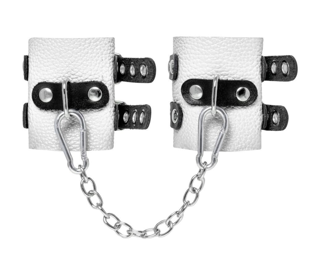 Основатели бренда уверены: лучший способ избавиться от искушения - поддаться ему! Мягкие, белые, кожаные наручники с двумя чёрными, жёсткими ремнями могут стать стильным аксессуаром, а могут послужить вашим целям по своему прямому назначению. Частичное обездвиживание и невозможность двигать руками дают вам полную власть над партнером – взрослые игры для взрослых. Наличие двух колец и карабинов, соединенных между собой металлической цепочкой, позволяет использовать изделие как раздельно – аксессуар-манжеты, так и как наручники для фиксации. К широким металлическим кольцам также можно присоединить и другие аксессуары при помощи карабинов. Благодаря универсальному размеру наручники могут использоваться и мужчинами, и женщинами. Длина манжет - 18 см, ширина - 7 см.