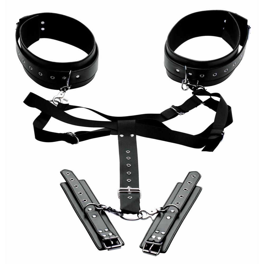 Наденьте на своего саба эту систему для фиксации, чтобы раздвинуть ноги и держать запястья за спиной. Четыре точки регулировки позволяют подогнать нагрудный ремень по размеру. Элегантные манжеты на щиколотках и запястьях также полностью регулируются с помощью пряжек.  Задний ремень регулируется от 12,7 до 25,5 см.