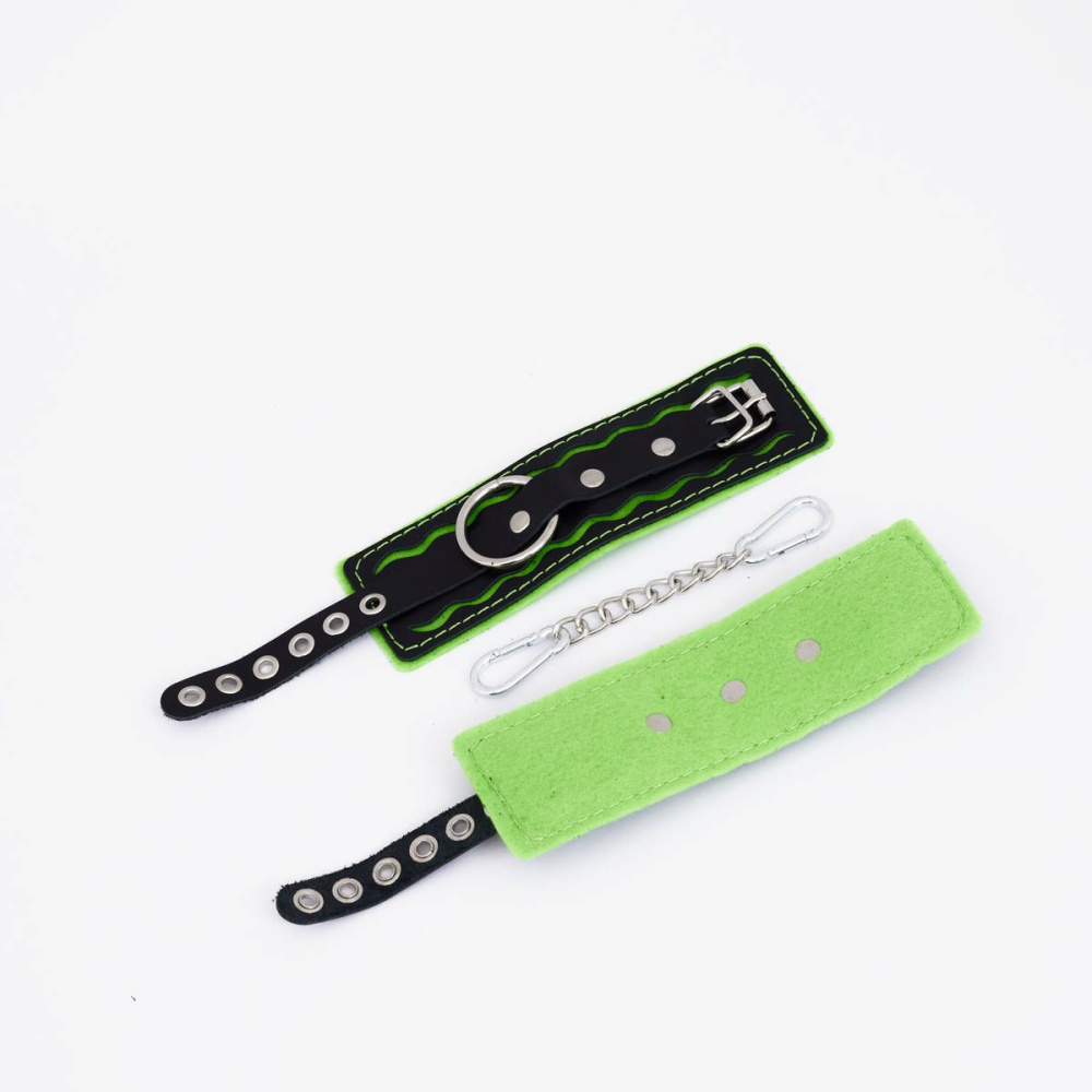 Изделие выполнено из 100% натуральной кожи , которая мягко облегает, обеспечивая комфорт даже при длительном использовании. В центре внимания — стальное хромированное кольцо из нержавеющей стали , которое добавляет конструкции прочности и элегантности. А мягкая подкладка кислотно-салатового цвета с контрастной строчкой делает эти наручники по-настоящему запоминающимися и дерзкими.