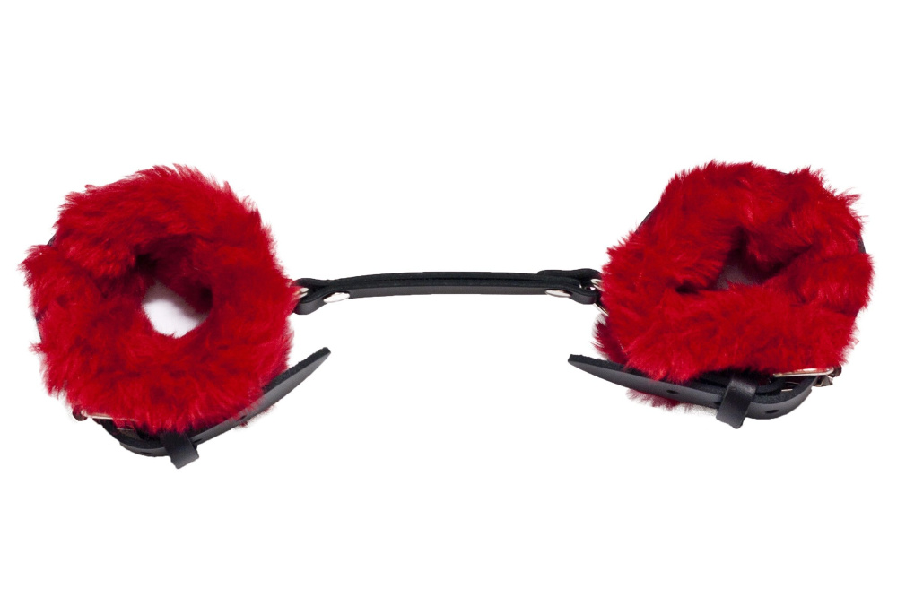 Купить Черные базовые наручники из кожи с красной опушкой Лунный свет по лучшей цене с доставкой - секс-шоп Ynunu.ru