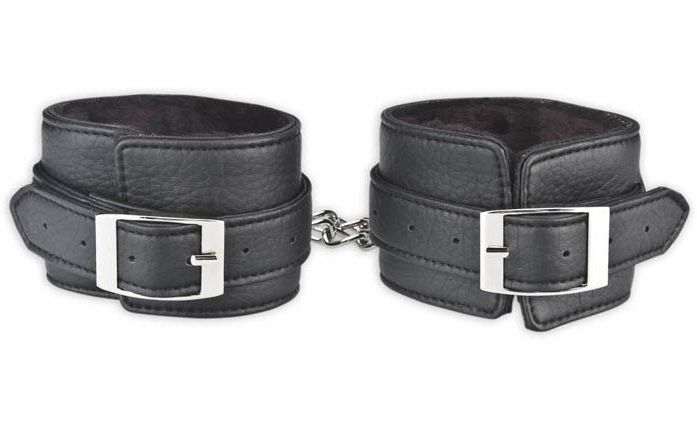 Черные фиксаторы для ног из искусственной кожи с мягким черным мехом внутри для большего комфорта при сковывании Вашего партнера. Между собой браслеты соединяются металлической цепью с крупными звеньями, застегиваются на замок с ключами (есть в комплекте).