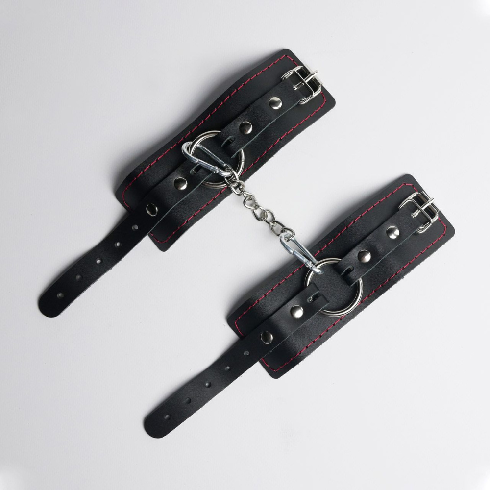 Черные кожаные наручники с красной строчкой