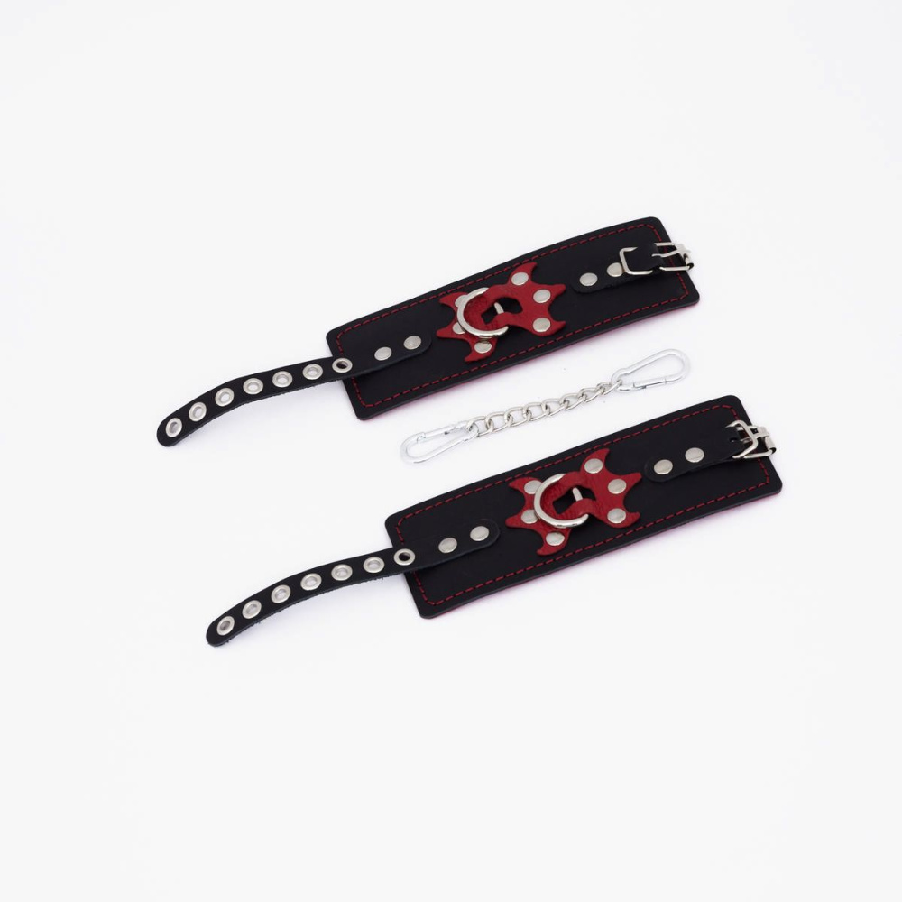 Черные кожаные наручники с красным декором и строчкой