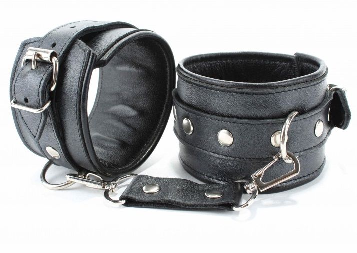 Наручники выполнены из гладкой черной натуральной кожи. Изделие декорировано металлическими заклёпками. Наручники надежно фиксируются пряжками и ремнями, позволяющими выбрать нужный размер, подойдут на обхват руки от 15 до 25 см. Кожаное соединение на карабинах фиксирует наручники вместе. На каждом аксессуаре полукольцо из сварной фурнитуры. Стильные наручники помогут воплотить эротические фантазии в реальность. Ширина - 6 см.