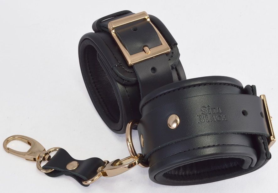 Купить Черные кожаные наручники с золотистыми пряжками и карабином Sitabella по лучшей цене с доставкой - секс-шоп Ynunu.ru
