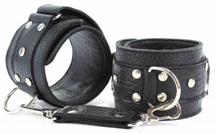 Оковы из натуральной кожи высокого качества. При производстве использована усиленная металлическая фурнитура. Подклад выполнен из нежной перчаточной кожи. Два металлических полукольца соединяются с помощью ремешка с карабинами. Фиксируются на ноге с помощью липучки, подойдут на обхват от 19 до 25 см. Стильный аксессуар поможет воплотить эротические фантазии в реальность. Длина соединения – 14 см.