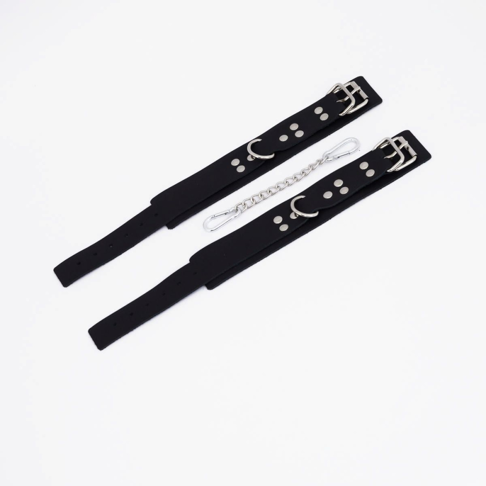 Оковы регулируются с помощью прочного ремешка из натуральной кожи , что позволяет настроить размер под любой обхват (от 24 до 33 см). В комплект входит прочная соединительная цепочка с двумя карабинами , обеспечивающая надежность и контроль.