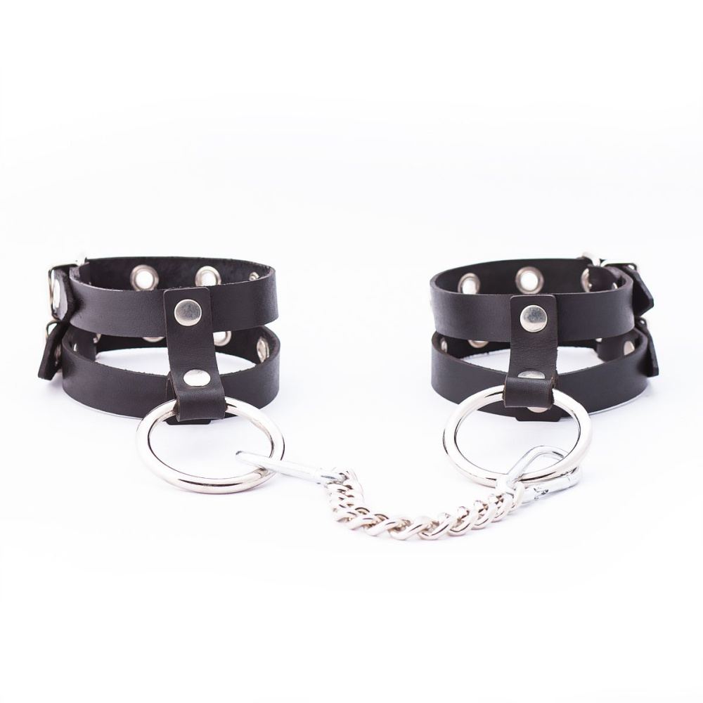 Оковы представляют собой два ремешка из натуральной кожи, соединенных посередине. Минималистичный дизайн позволяет использовать их не только для фиксации рук в любовных играх, но и в качестве аксессуара для дополнения образа. В комплекте стальное кольцо и соединительный элемент в виде прочной цепочки с двумя карабинами. Общая длина - 28 см.