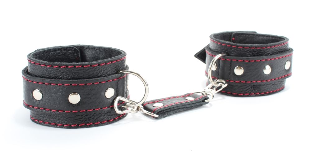 Оковы выполнены из черной натуральной кожи с красной контрастной строчкой. На ремнях украшение в виде металлических холнитенов. Оковы надежно фиксируются пряжками и ремнями, позволяющими выбрать нужный размер, подойдут на обхват от 18 до 27 см. Кожаное соединение на карабинах фиксирует оковы вместе. Аксессуар позволяет в полной мере насладиться сексом в стиле БДСМ. Ширина - 5 см.