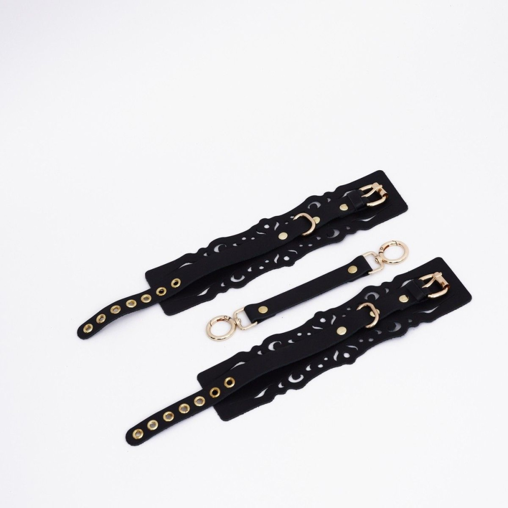 Оковы с узорным дизайном из натуральной кожи с золотой фурнитурой. Резные элементы придают атмосферу нежности, элегантности и подчеркивают красоту тела. Регулируются ремешком, а также в комплекте прочный соединитель с двумя карабинами. Доставляется в фирменной упаковке в виде брендированной деревянной подложки. Длина манжеты - 25,5 см.