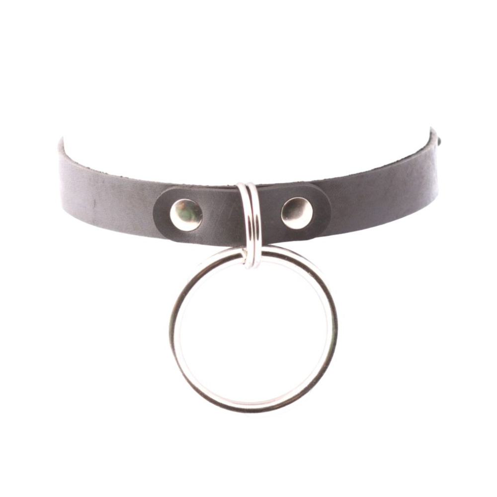 Однослойный чокер из натуральной кожи. Посередине расположен кожаный элемент, на котором прочно закреплено стальное хромированное кольцо. Расположение кольца дает преимущество в разнообразии практического использования чокера во время любовных игр, а классический вид изделия позволяет носить его и в качестве аксессуара для дополнения образа. Общая длина - 40 см.