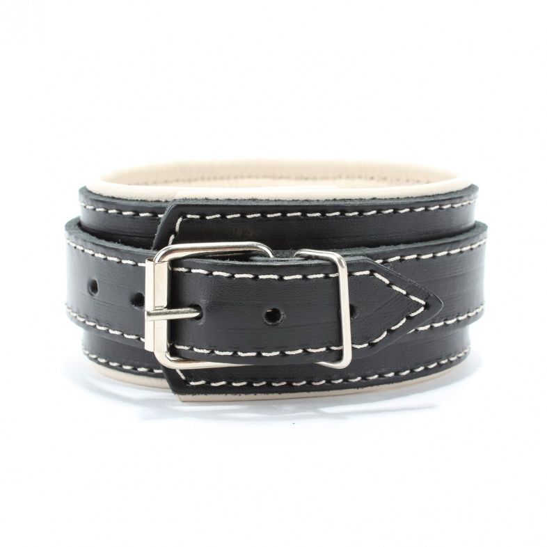 Ошейник выполнен из толстой ременной кожи с подкладном из светло-бежевой перчаточной кожи. Аксессуар декорирован светлой строчкой. Ремень позволяет выбрать нужный размер, подойдет на обхват от 28 до 36 см. Мягкий подклад обеспечивает комфорт, помогая полностью погрузиться в БДСМ игру. Ширина - 6 см.