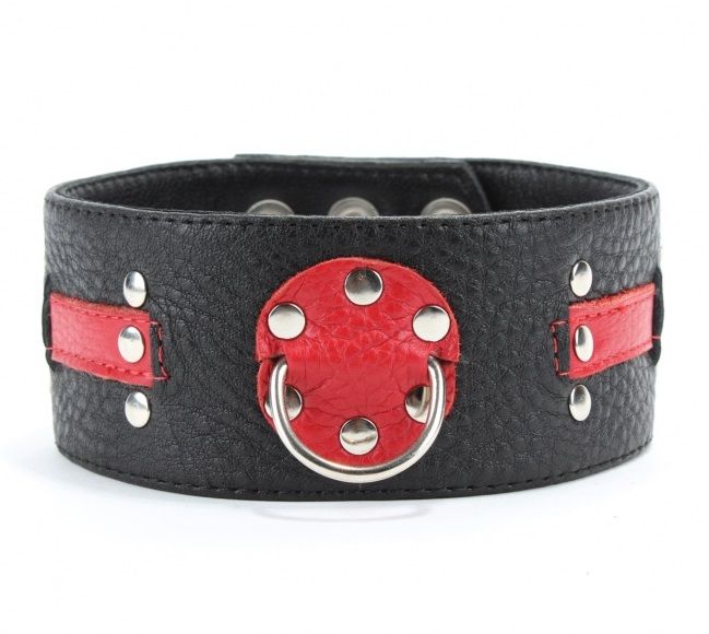 Ошейник выполнен из натуральной кожи черного цвета, декорирован вставками из красной кожи, заклепками. Ошейник фиксируется металлическими кнопками, позволяющими подобрать нужный размер, подойдет на обхват от 31 до 36 см. Подклад из нежной кожи обеспечивает комфорт. Стильный аксессуар поможет воплотить самые смелые фантазии фантазии в реальность. Ширина ошейника - 5 см.