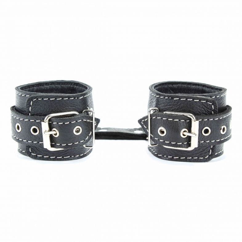 Оковы выполнены из черной натуральной кожи с белой контрастной строчкой. Надежно фиксируются ремешками, которые позволяют выбрать нужный размер, подойдут на обхват от 17 до 27 см. Металлическая пряжка крепко удерживает в подчинении, кожаное соединение на карабинах фиксирует оковы вместе. Мягкий подклад из перчаточной кожи обеспечивает комфорт, помогая полностью погрузиться в БДСМ игру. Ширина - 6 см.
