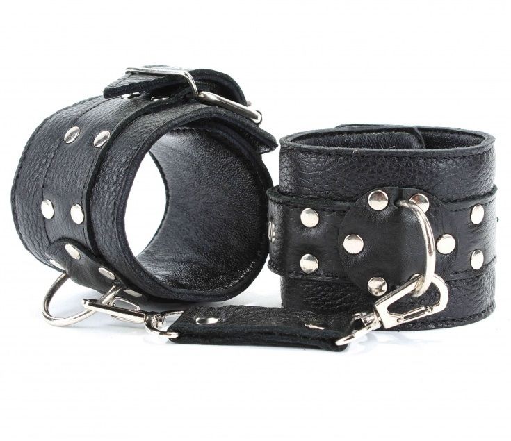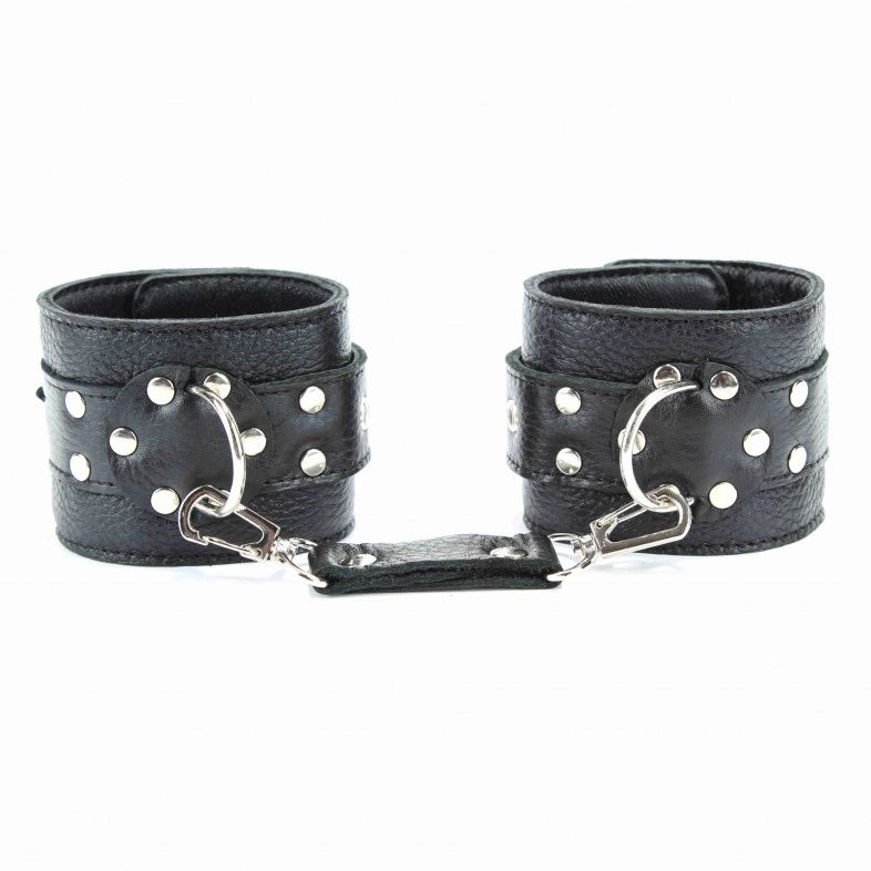Наручники выполнены из натуральной кожи черного цвета. Изделие декорировано заклепками. По середине расположено полукольцо из сварной фурнитуры. Наручники надежно фиксируются пряжками и ремнями, позволяющими выбрать нужный размер, подойдут на обхват руки от 16 до 25 см. Кожаное соединение на карабинах фиксирует наручники вместе. Приятные для тела и стильные наручники отлично подходят для воплощения эротических БДСМ игр. Ширина - 6 см.