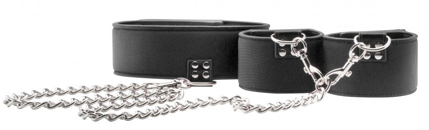 Купить Чёрный двусторонний ошейник с наручниками Reversible Collar and Wrist Cuffs Shots Media BV по лучшей цене с доставкой - секс-шоп Ynunu.ru