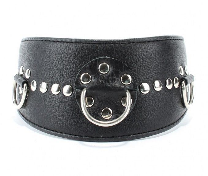 Чёрный кожаный ошейник с полукольцами и клёпками
