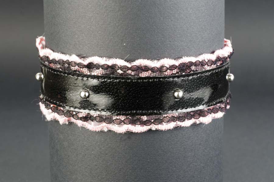 Подшитый; кожа лак, кружева черные с розовым, застежка - кнопка, с 7 металлическими капельками.