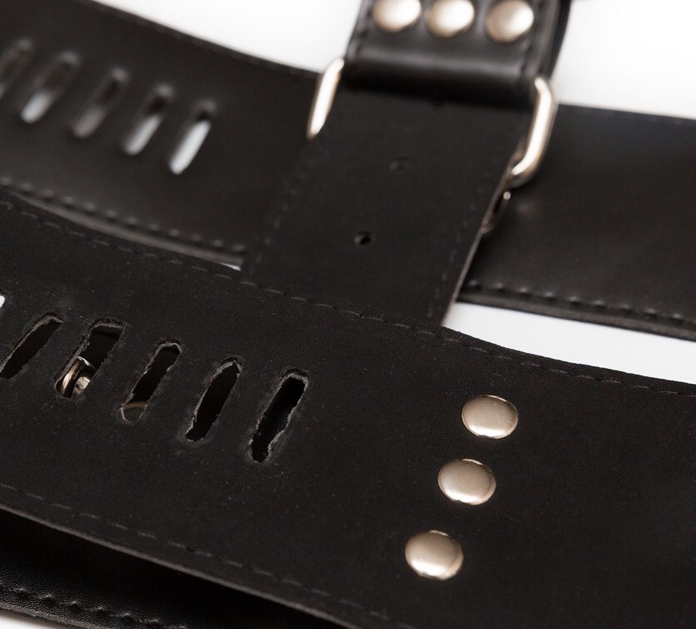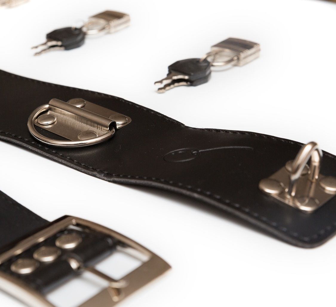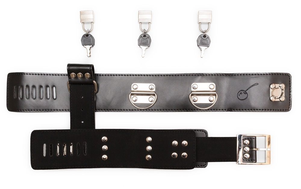 Отличный набор для фиксации нижнего: ошейник с пристегнутыми наручниками.  Сделан из эко-кожи, декорирован металлическими элементами. Особенный элемент - замочки с ключами, которыми можно крепко зафиксировать застежки.