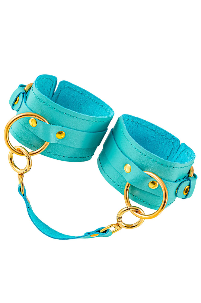 Готовы играть по-взрослому? Не бойтесь своих желаний! Основатели бренда уверены: лучший способ избавиться от искушения - поддаться ему! Добавьте пикантную деталь в ролевую игру и воплотите самую смелую сексуальную фантазию в реальность! Эти однослойные кожаные голубые (бирюзовые) оковы со строчкой в тон кожи могут стать стильным аксессуаром, а могут послужить вашим целям по своему прямому назначению. Частичное обездвиживание и невозможность двигать руками или ногами дают вам полную власть над партнером – взрослые игры для взрослых. Наличие двух колец и карабинов, соединенных между собой кожаным ремешком, позволяет использовать изделие как раздельно – аксессуар-манжеты, так и как оковы для фиксации. К широким металлическим кольцам также можно присоединить и другие аксессуары при помощи карабинов. Благодаря универсальному размеру оковы могут использоваться и мужчинами, и женщинами. Размер легко регулируется с помощью металлических пряжек, органично вписывающихся в общий стиль. Длина манжет – 25 см, ширина - 6,5 см.