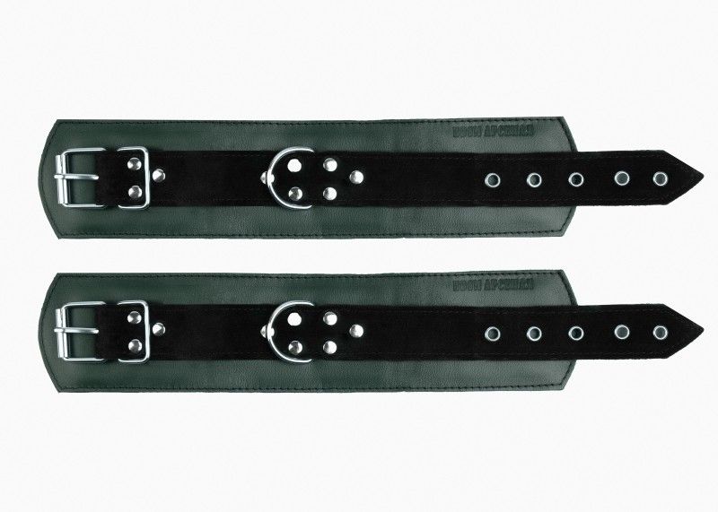 Оковы выполнены из натуральной кожи. Внутренняя подкладка мягкая, не доставит неприятных ощущений, благодаря тому что вся металлическая фурнитура спрятана за ней. За счёт карабинов легко разъединяются и быстро застёгиваются. Подойдут как для новичков, так и для профессионалов. Изделие декорировано ремнями из замши контрастного цвета. Посредине аксессуара расположено полукольцо из сварной фурнитуры. Оковы надежно фиксируются пряжками и ремнями, позволяющими выбрать нужный размер. Стильный аксессуар, отлично подходят для воплощения эротических БДСМ игр. Обхват наножников - 28 см., ширина - 6 см.