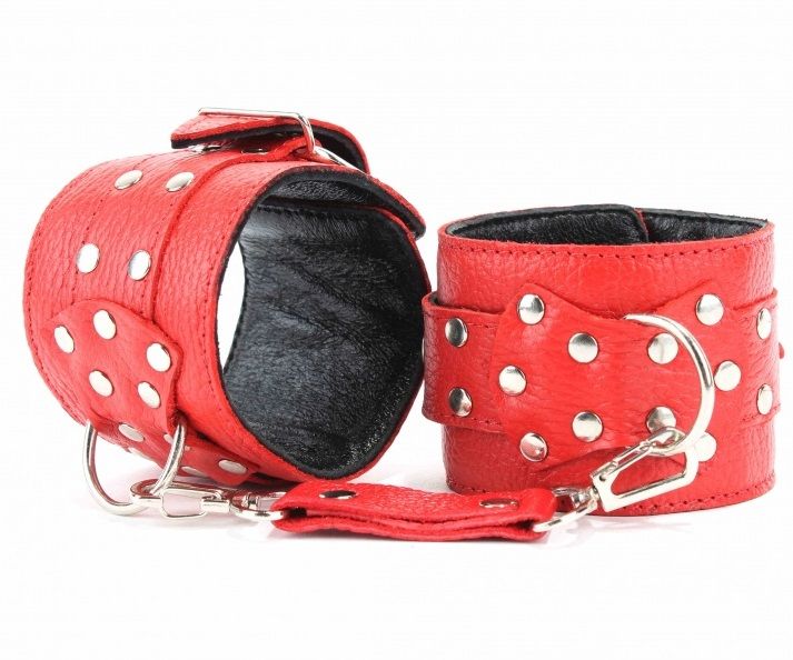 Наручники выполнены из натуральной кожи красного цвета. Декорированы заклепками и бантом с металлическим кольцом. Наручники надежно фиксируются пряжками и ремнями, позволяющими выбрать нужный размер, подойдут на обхват руки от 16 до 25 см. Нежный подклад из черной кожи обеспечивает комфорт, кожаное соединение на карабинах фиксирует наручники вместе. Аксессуар позволяет в полной мере насладиться сексом в стиле БДСМ. Ширина - 6 см.