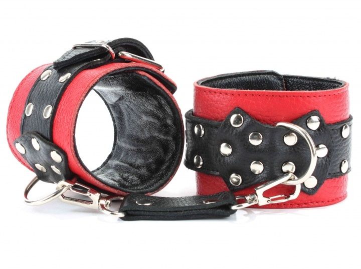 Наручники выполнены из красной натуральной кожи, с ремнями из черной кожи. Аксессуар украшен металлическими заклёпками и декором в виде банта с металлическим полукольцом. Наручники надежно фиксируются пряжками и ремнями, позволяющими выбрать нужный размер, подойдут на обхват руки от 16 до 25см. Нежный подклад из черной кожи обеспечивает комфорт, кожаное соединение на карабинах фиксирует наручники вместе. Аксессуар позволяет в полной мере насладиться сексом в стиле БДСМ. Ширина - 6 см.