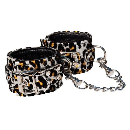 Оковы-манжеты на руки, которые закрепляются с помощью металлических застежек на ремешках имеют анималистическую раскраску под леопарда, декорированные платиновыми блестками и черным плюшем. Наручники между собой соединены металлической цепью. Длина цепи - 22 см.