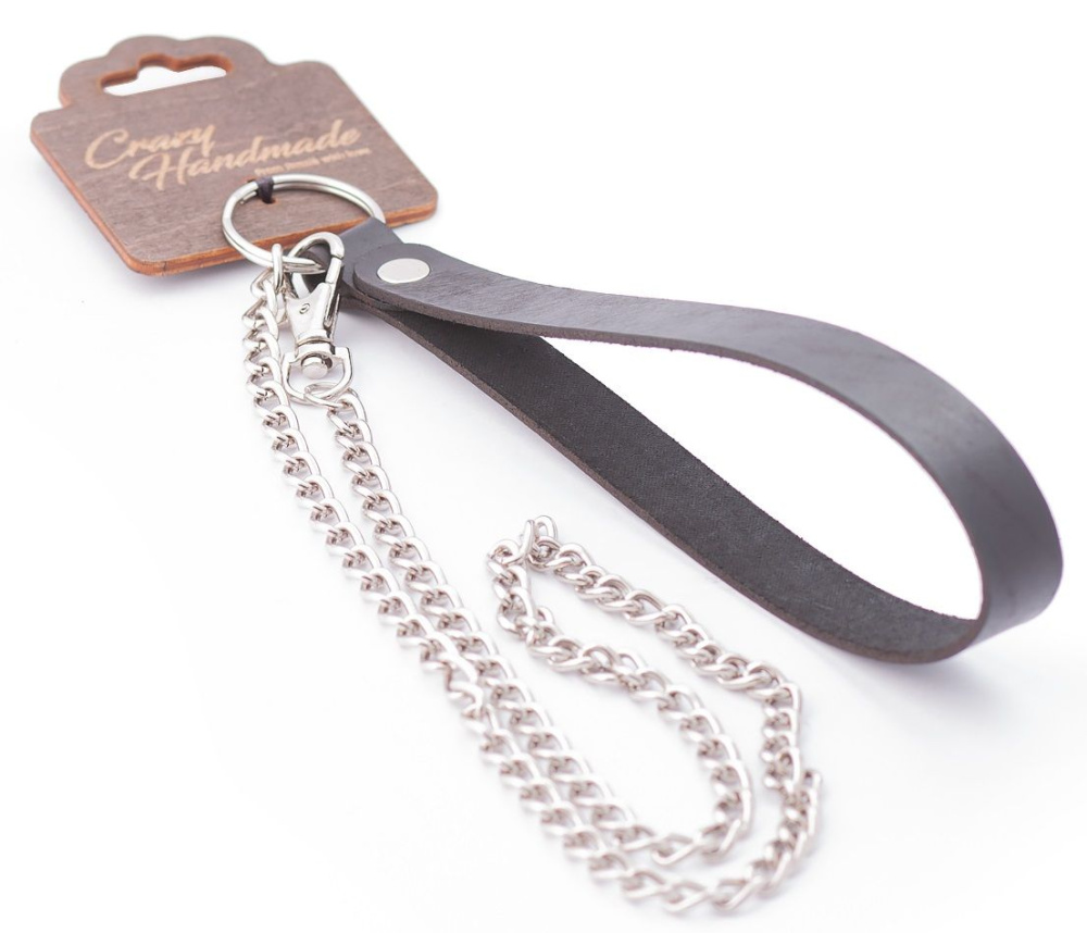 Купить Серебристый металлический поводок с кожаной черной ручкой - 80 см. Crazy Handmade по лучшей цене с доставкой - секс-шоп Ynunu.ru