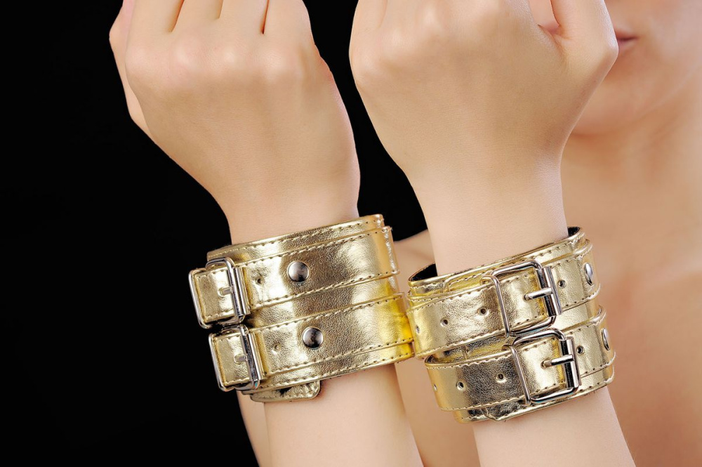 Изготавливаются из искусственной кожи. Цвет золото. С внутренней стороны подклада их мягкого меха. При изготовлении использована фурнитура с никелевым покрытием. Соединяются между собой коротким ремешком с двумя карабинами на концах. Не нарушают кровообращение, надёжно фиксируются на запястьях с помощью двух ремешков. Размер универсальный. Ширина - 5,8 см.