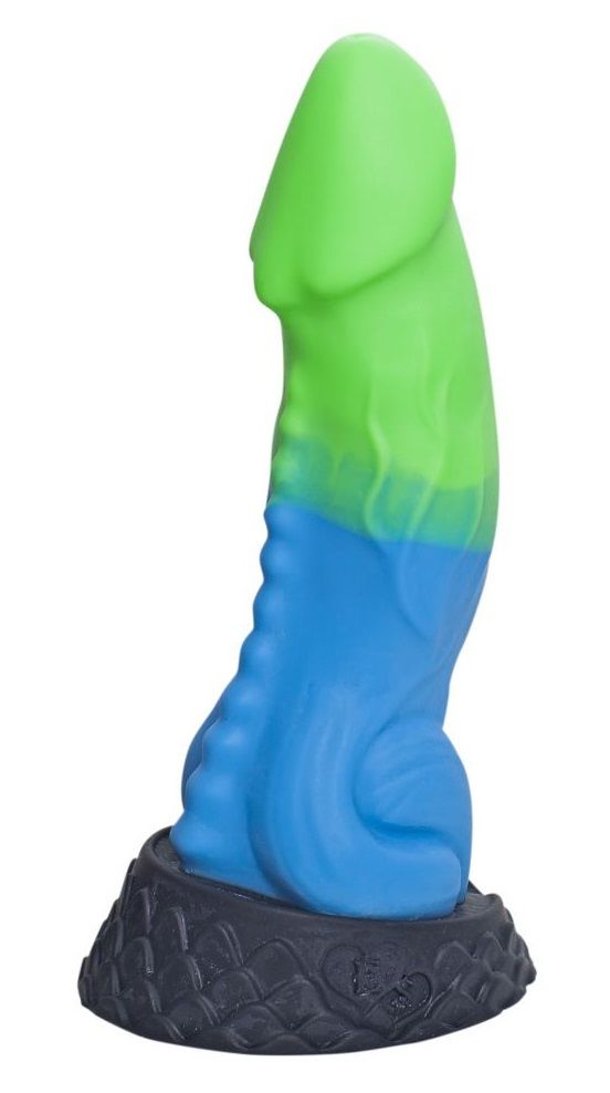 Купить Голубой фаллоимитатор Ночная Фурия Medium с зелёным кончиком - 24,5 см. Erasexa по лучшей цене с доставкой - секс-шоп Ynunu.ru