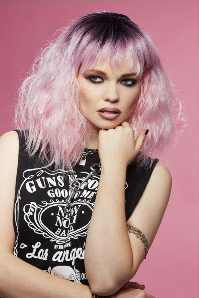 Парик с волнистыми волосами средней длины с челкой.