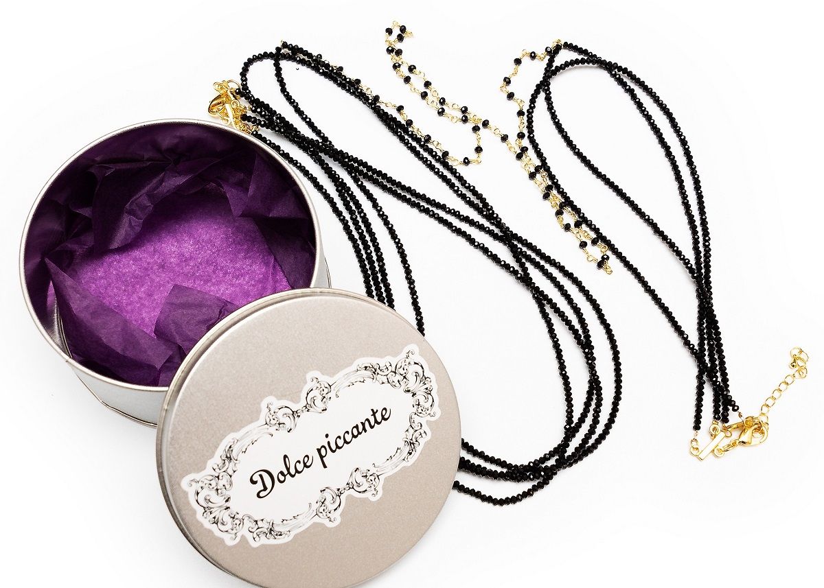 Утонченное колье на все тело. Из черного агата и металла цвета золота. Украшение для красивой ночи любви, восхитительно смотрится на обнаженной женской фигурке.   Родированный металл, безупречное исполнение. Металлическая коробочка-шкатулка. Потрясающе красивая коллекция аксессуаров для спальни от Dolce Piccante. Лимитированный тираж.   Размеры: