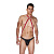 Боди для мужчин из блестящей ткани. Широкие резиновые ремешки переплетаются на шее, соединяются с трусами и двумя манжетами на руках, при помощи металлических колец. Вырез на ягодицах.