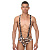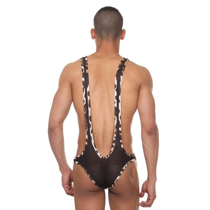 Боди для мужчин, в котором скомбинированы два типа ткани: мягкая, гладкая леопардовая и полупрозрачная черная сзади на ягодицах. Широкие отстроченные лямки соединяются с трусами-слипами.