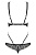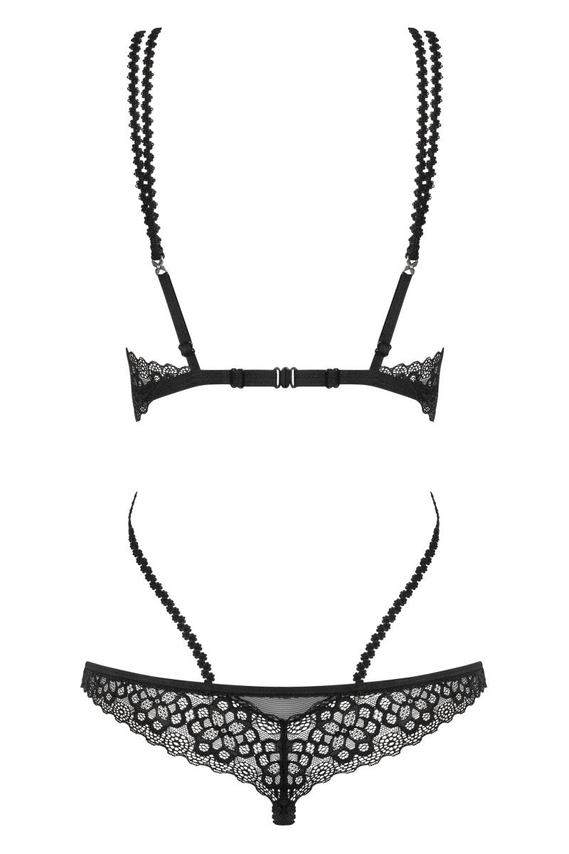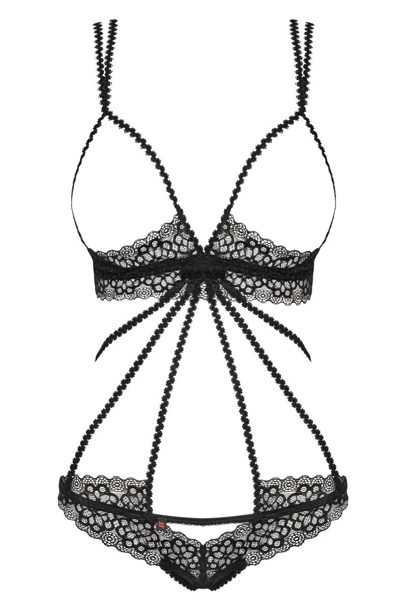 Страстное боди с открытой грудью и промежностью для горячей ночи. Изготовлено из кружева с цветочным орнаментом и тонких эластичных тесемок. Двойные бретели регулируются по длине, сзади застежка на крючок. Декоративные украшения с маленькими кристаллами украшают боди на спинке.