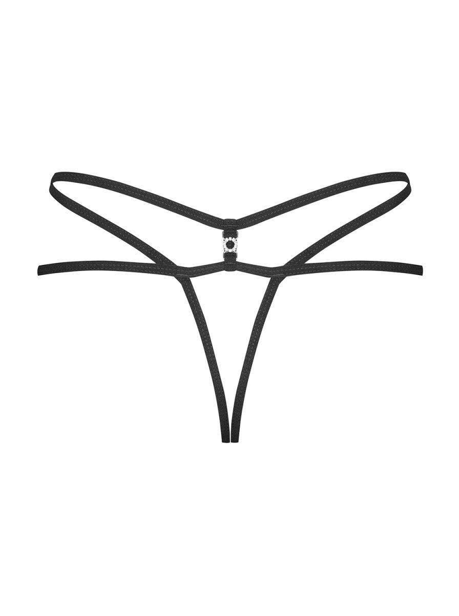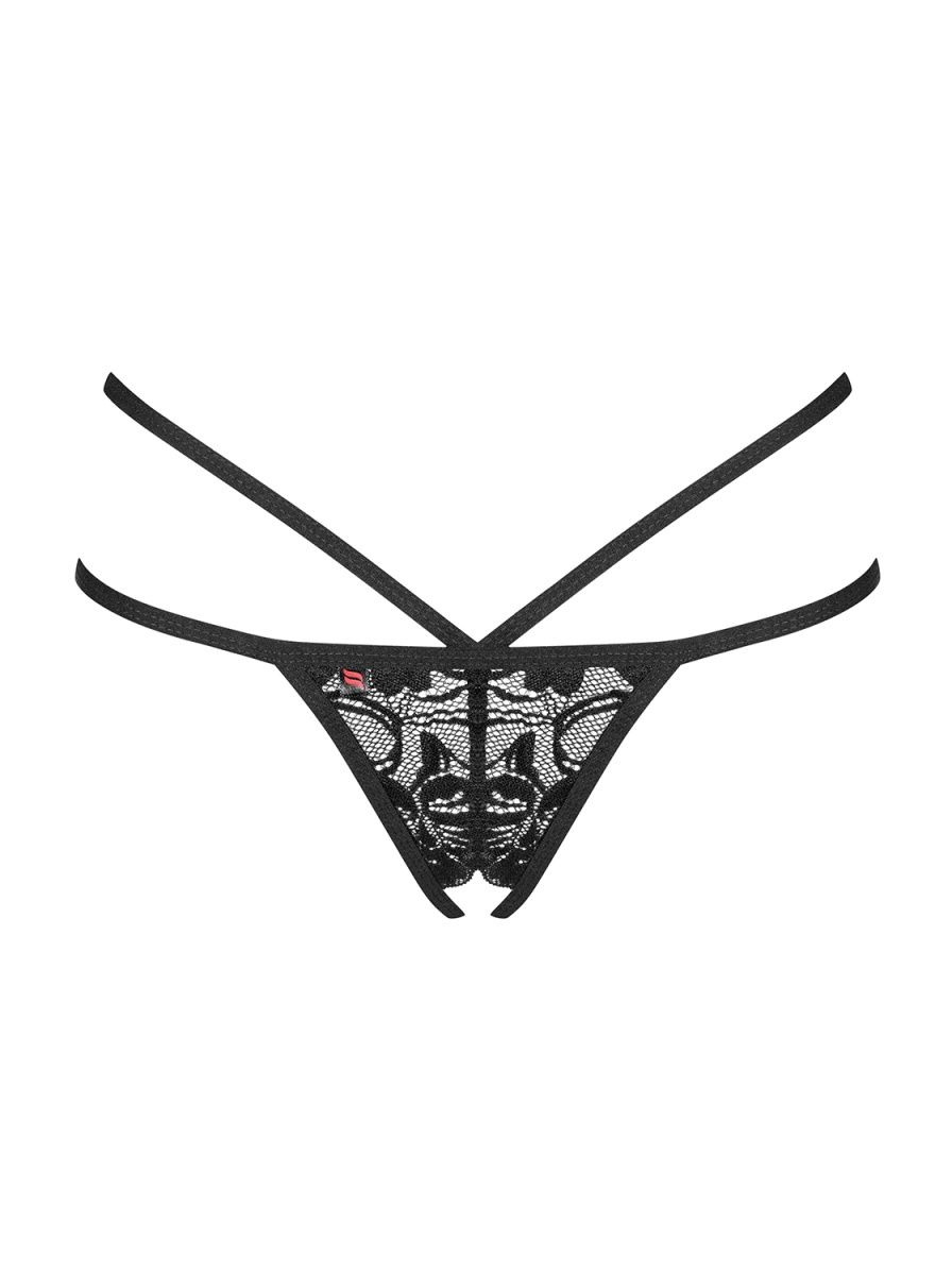 Пикантные стринги с открытой промежностью. Изготовлены из узорчатого кружева и тонких эластичных ремешков, игриво переплетающихся сзади. Декоративное украшение добавляет модели элегантности.